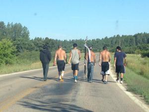 The runners began their run at Oyate Wahacanka Woecun, which is the Rosebud Sioux Tribe’s Spiritual Camp near Ideal Community, at approximately 1am on Thursday, July 31. Each young man committed to run approximately 12 miles in the spiritual relay. The last two miles of the relay were completed as a group walk. The six young men walked into the Sundance grounds at approximately 10am to bring the prayers of many who are concerned about the effects of the pipeline on the land and water to the Sundance Tree at Crow Dog’s Paradise.