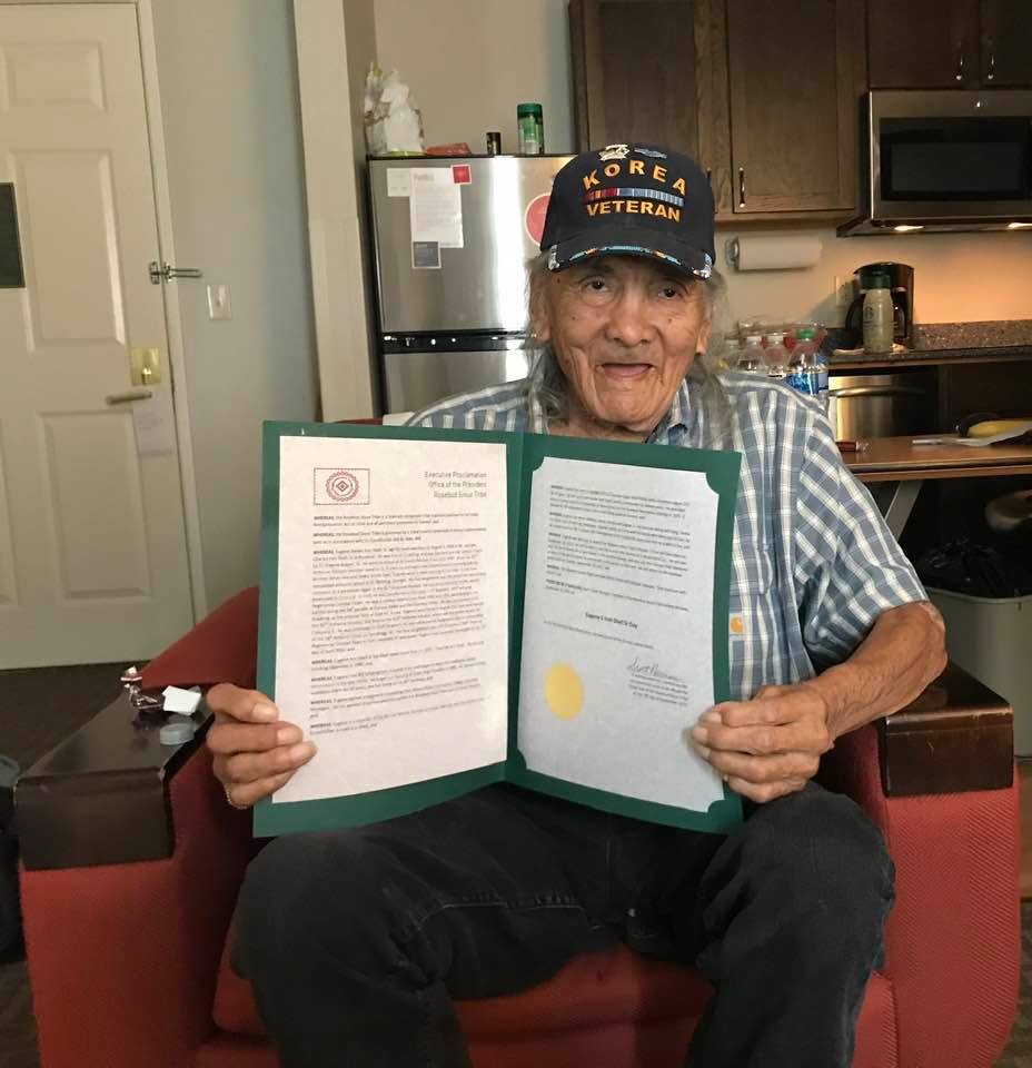 A proclamation issued by Scott Herman, Rosebud Sioux Tribal President, declared September 19, 2021 as Eugene S Iron Shell Sr Day. It read in part: “Eugene Steven Iron Shell, Sr., age 92 years was born on August 6, 1929 to Mr. and Mrs. Charles Iron Shell, Sr. in Rosebud. He was one of 13 siblings and was baptized into the Catholic Church by Fr. Eugene Buechel, SJ. He went to school at St. Francis Mission From 1935-1947. When the 82nd Airborn Division recruiter came to St. Francis, he enlisted in the United States Army along with his brother James and also Doley White Eyes.”