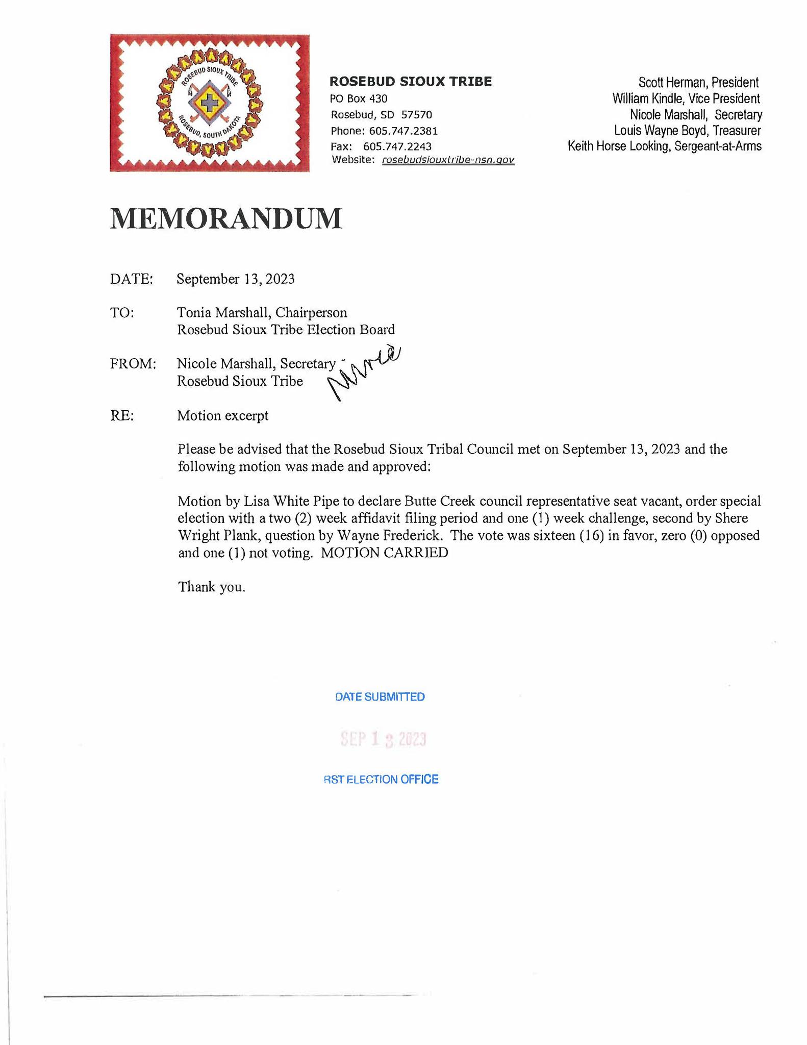 According to a Motion Excerpt issued by the Tribal Secretary, the action was approved after a lengthy executive session at the September 13 regular tribal council meeting. The action reads “Motion by Lisa White Pipe to declare Butte Creek council representative seat vacant, order special election with a two (2) week affidavit filing period and one (1) week challenge, seconded by Shere Wright Plank, question by Wayne Frederick. The vote was sixteen (16) in favor, zero (0) opposed and (1) not voting. MOTION CARRIED.”
