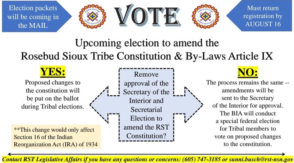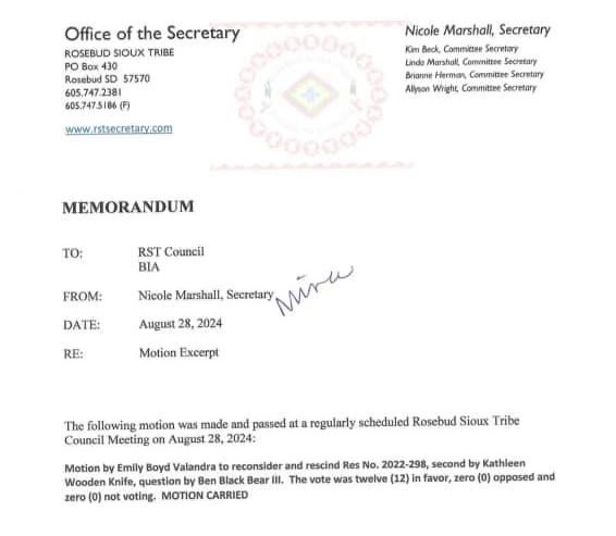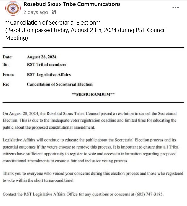 A memorandum from the RST Legislative Affairs was issued on August 28, 2024 and shared on social media following the tribal council action. The memo read in part: “the Rosebud Sioux Tribal Council passed a resolution to cancel the Secretarial Election. This is due to the inadequate voter registration deadline and limited time for educating the public about the proposed constitutional amendment.”