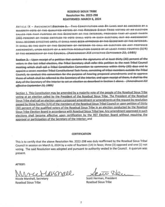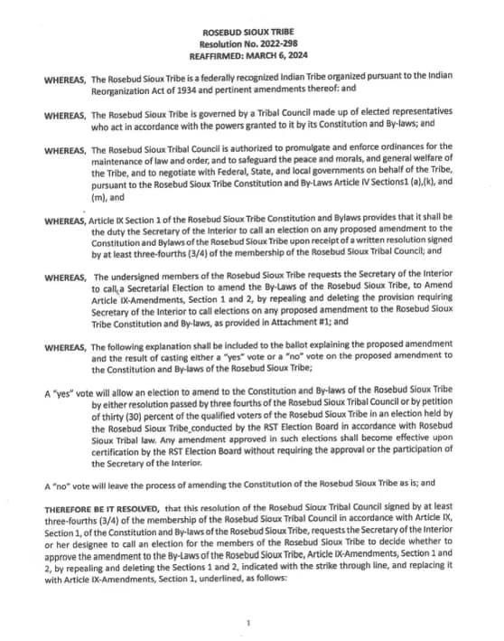 Resolution 2022-298 likely originated through a petition resolution, which was then “reaffirmed by the Rosebud Sioux Tribe Council in session on March 6, 2024 by a vote of fourteen (14) in favor, three (3) opposed and one (1) not voting.” The amendment, if passed by a majority of tribal voters, would have changed Article XI of the RST Constitution by removing all of Section 2 and replacing Section 1 as follows: