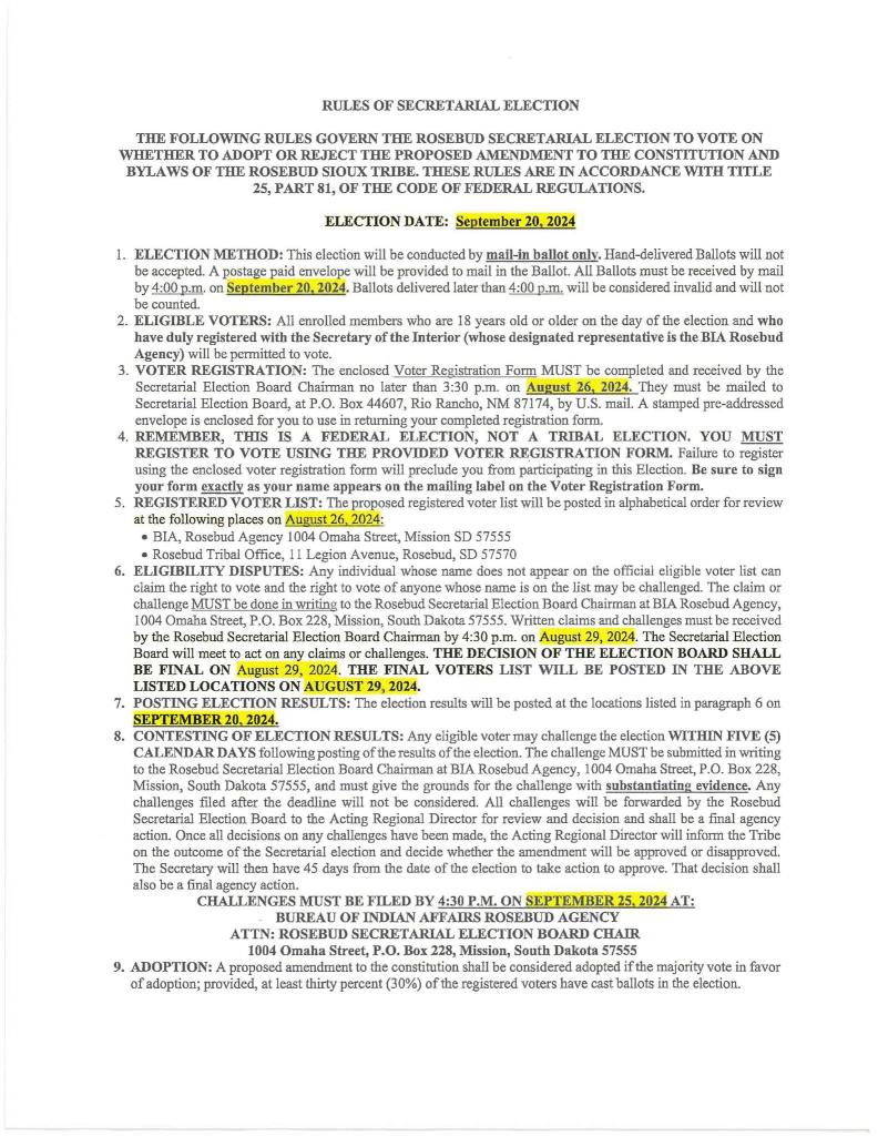 The Secretarial Election scheduled for September 20, 2024 is now cancelled. For more information, please call the Rosebud Sioux Tribe at 605-747-2381.