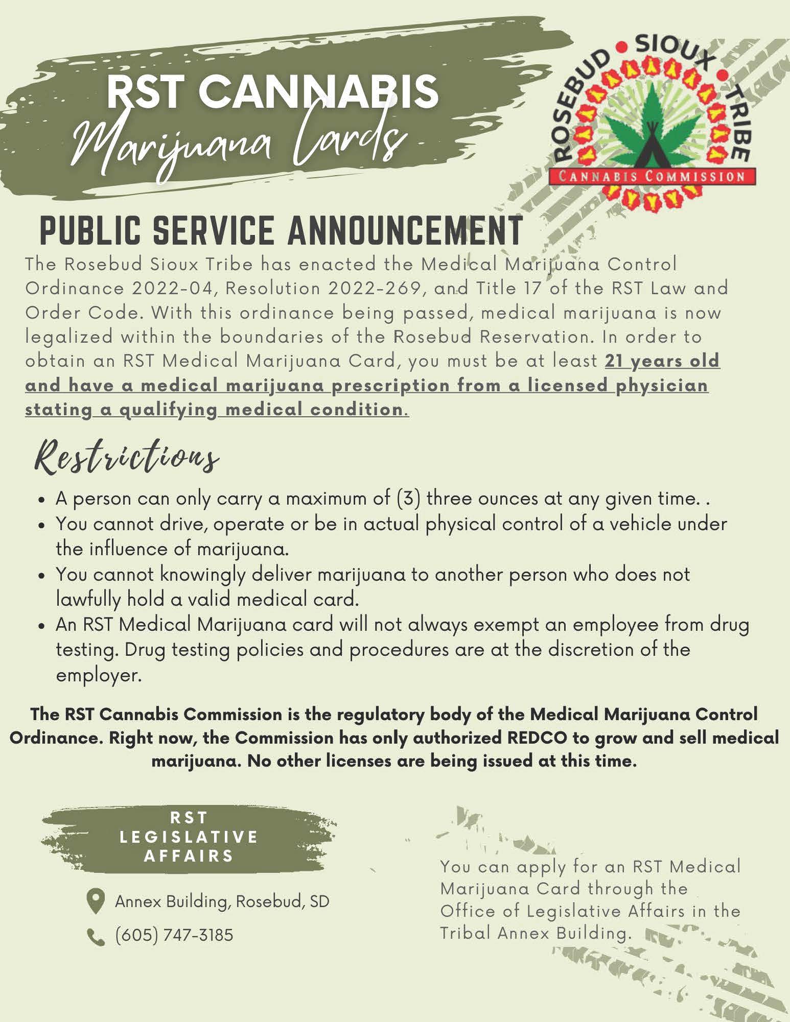 Interested persons can apply for an RST Medical Marijuana Card through the Legislative Affairs office located in the tribal annex building in Rosebud, SD. For more information call 605-747-3185.