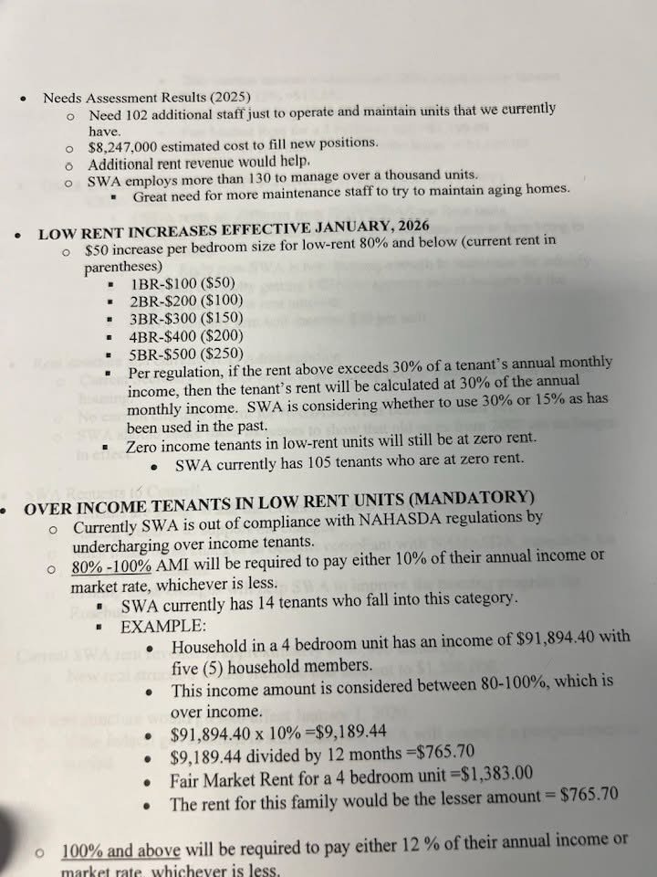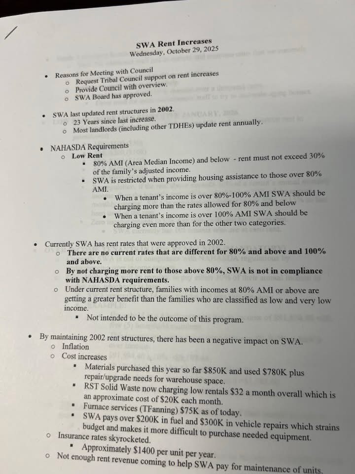 The higher rent increases being proposed by SWA would be effective January 1, 2026. Rent would increase at least $50 per bedroom for United States Department of Agriculture (USDA) units. The USDA rents are different from the NAHSDA or low rent units. In recent years USDA has urged SWA to increase rents to help bring it bring in more subsidy funding. SWA is currently not charging enough to maximize the subsidy to maintain housing repairs. SWA had difficulty getting USDA to approve recent budgets for the program due to low rent collection amounts USDA monthly rent will increase $50 per bedroom, per unit. For a one bedroom it’s $50 it would increase to $100 a two bedroom is currently $100 it would increase to $200, a 3 bedroom is currently $150 and will increase to $300. The four bedroom is currently $200; it would increase to $400. The 5 bedrooms are now at $250 and they would increase to $500. Also, per regulations if the rent above exceeds 30% of a tenant’s annual monthly income than the tenant’s rent will be calculated at 30% of the annual monthly income. SWA is considering whether to use 30 or 15% as that’s what has been used in the past. Zero income tenants in low rent units will still be at zero rent. SWA currently has 105 tenants paying zero rent.