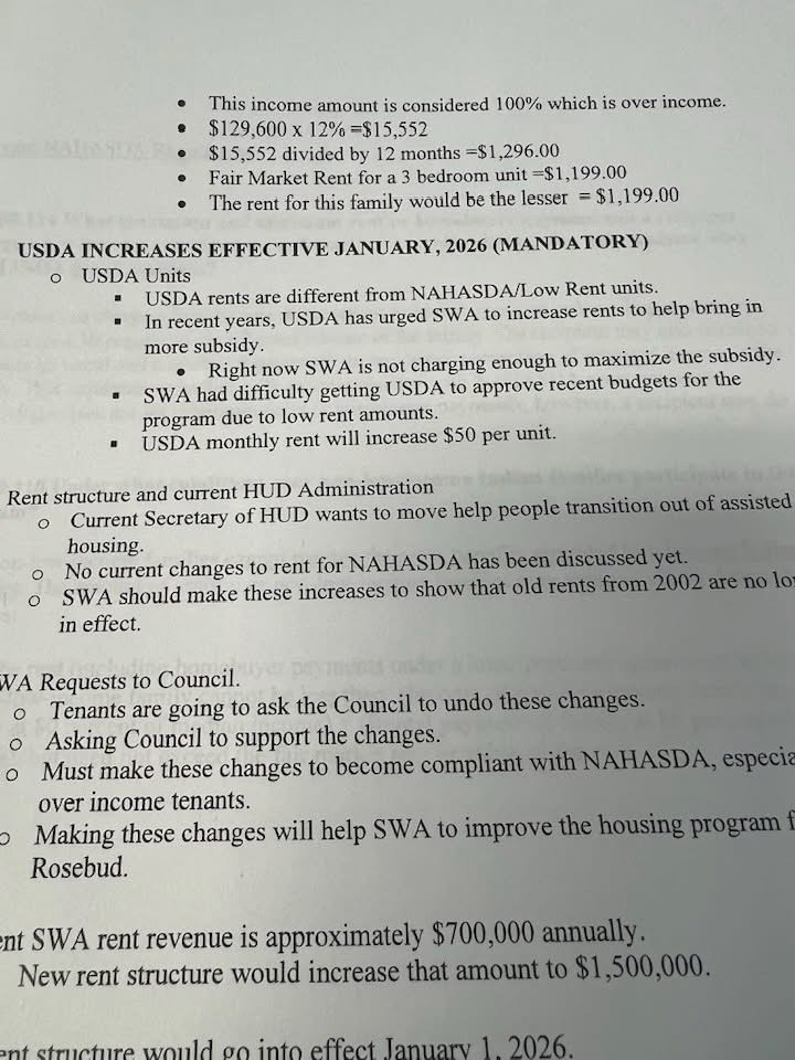 In a recent Rosebud tribal council meeting, SWA officials discussed increasing rent on Rosebud’s units, however no council action was taken on the SWA proposal.